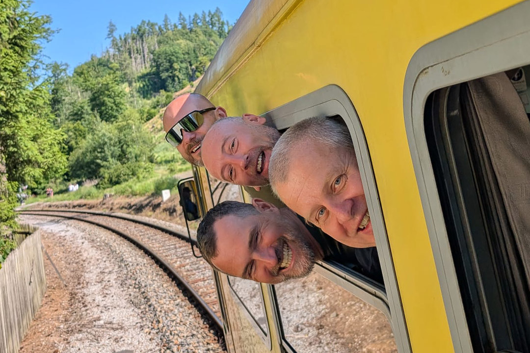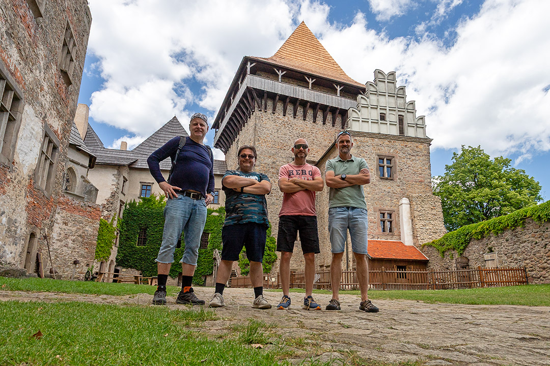V 9 už jsme stáli na perónu a vyhlíželi náš spoj. Mezitím se Petr ujal online nákupu jízdenek a za pomoci všech ostatních se mu tento úkon nakonec podařilo dokončit a my mohli s klidem nastoupit do vlaku. Ten nakonec dorazil s několikaminutovým zpožděním, což ale nijak nesnížilo naše nadšení z první posázavské trasy. Jízda až do stanice Sázava trvala více než hodinu, vlak se coural a stavěl takzvaně na každém rohu. Mimochodem, už když jsme do vlaku nastoupili, byl plný vodáků, kteří pak hromadně vystoupili ve stanici Český Šternberk. Stejnojmenný krásně zachovalý hrad byl vidět už během cesty, nicméně jeho návštěvu jsme si nachystali až na druhý den. Napadlo nás pořídit si skupinovku ve vlaku jako kdysi na Šumavě v roce 2005. Zbyněk oslovil vedle sedící slečnu a požádal ji, zda by nám udělala tak trochu specifickou fotku. Po první sérii fotek se slečna sama ptala, zda chceme vyfotit ještě jednou a na podruhé se nám konečně podařilo pěkný záběr pořídit.