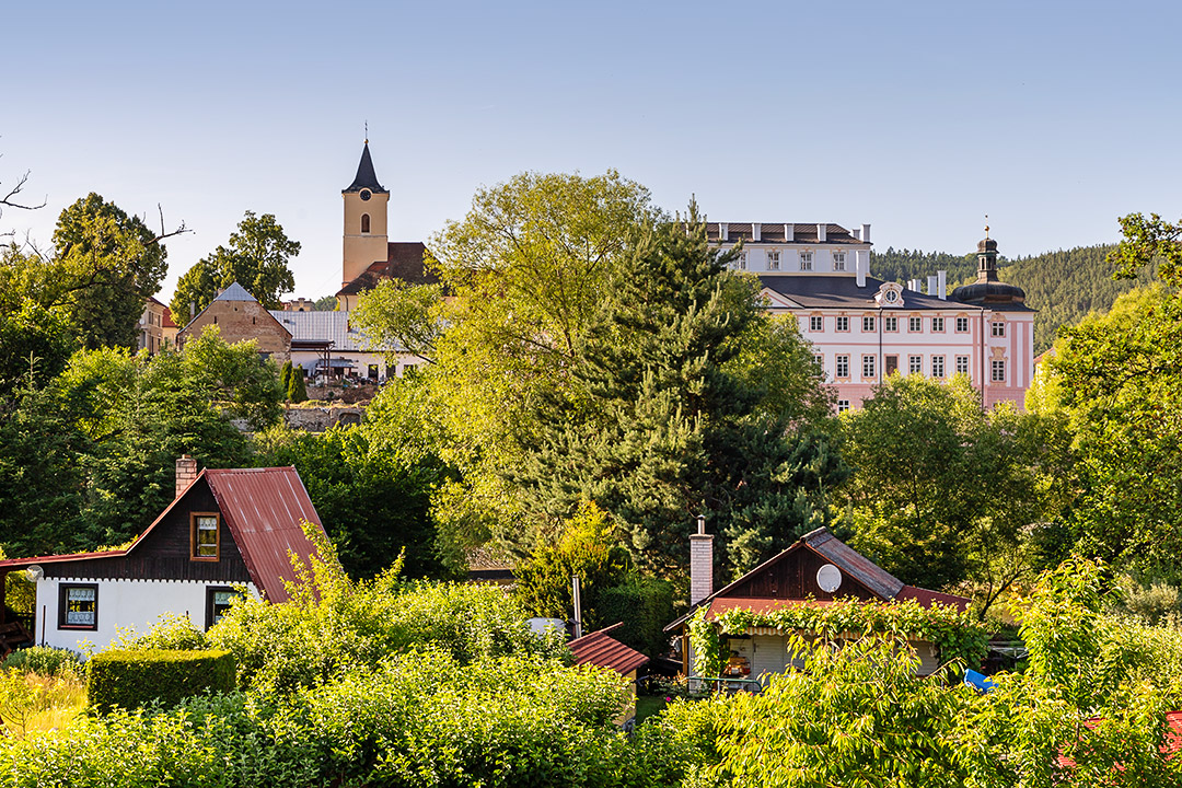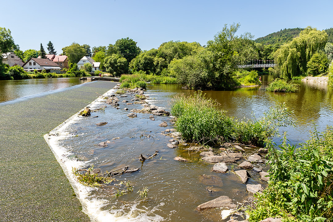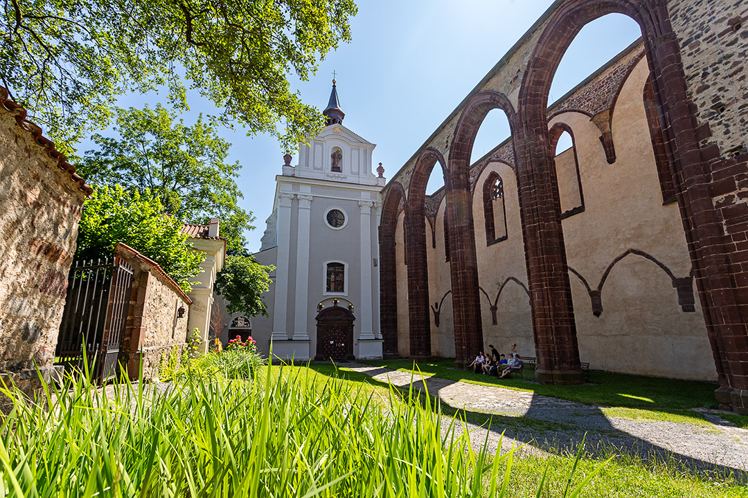 Před půl jedenáctou jsme konečně vystoupili z vlaku a tím odstartovaly naše první kilometry. Nebe bylo bez mráčku a teploty atakovaly třicítku, zkrátka pořádná výheň. Ze zastávky jsme si to namířili přes most rovnou k místnímu klášteru, jehož historie sahá až do 11. století. V posledních letech se mimo jiné proslavil díky hře Kingdom Come: Deliverance. V té se objevilo i další místo, které jsme se chystali dnes navštívit. V areálu kláštera bylo poměrně rušno a chvíli jsme přemýšleli o prohlídce. Petr nás však přesvědčoval, že zde byl minulý rok a že není až tak moc o co stát, a tak jsme nakonec pouze prozkoumali exteriéry a pořídili nějaké fotky do kategorie Historické skvosty.