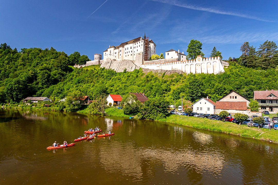 V 9:45 jsme už vystupovali v zastávce Český Šternberk a ihned začali fotit nad řekou stojící stejnojmenný hrad. Zejména z mostu byly scenérie překrásné, když se hrad zrcadlil na hladině a po řece pluly lodě s vodáky. Pomalu jsme došli až na nádvoří hradu, odkud je naopak pěkný výhled na městys a okolí. Prohlídka začínala v půl 11, což bylo tak akorát, abychom si ještě stihli dát zmrzlinu. Petr prohlídku vynechal, neboť tvrdil, že zde nedávno byl. Zbytek tedy absolvoval prohlídku s průvodcem trvající asi hodinu. Petr mezitím šmejdil v hradním areálu a pomalu se přesunul k hladomorně hradu, která je vzdálená asi 200 m jižně. Hladomorna je taktéž přístupná veřejnosti a nabízí hezký výhled. U pokladny hladomorny jsme se dali do řeči s paní, která prodávala lístky a tázali se na možnosti dobré restaurace v okolí, resp. na naší trase, která vedla po červené dále na jihovýchod. Byl nám doporučen motorest U Rybiček, který se specializuje mimo jiné překvapivě na ryby.