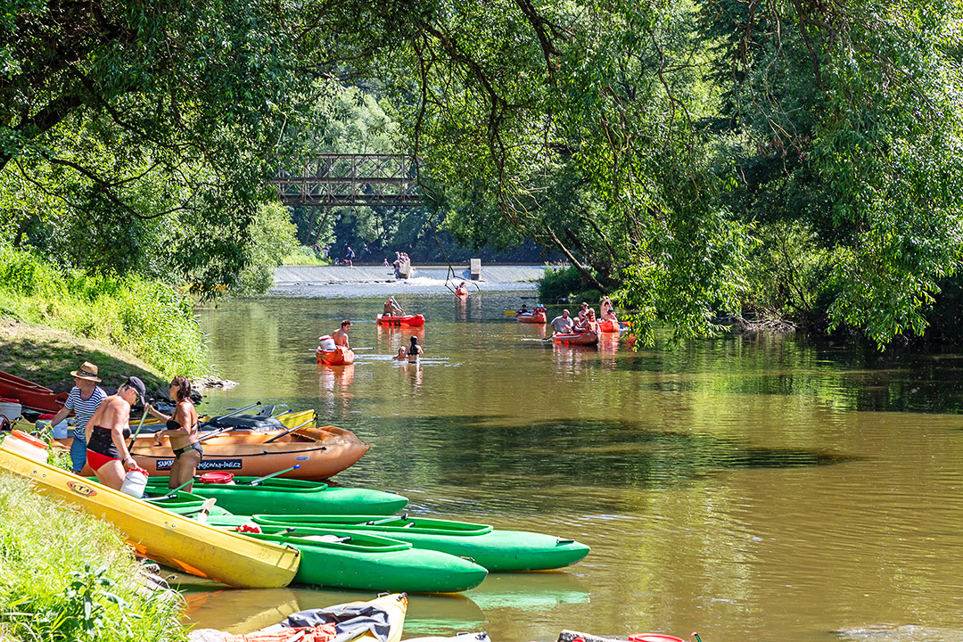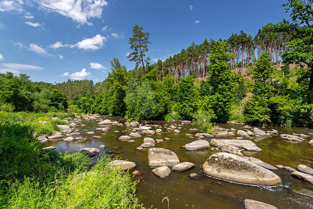 Zbyněk se mezitím usadil v občerstvení Pyramida, kde si objednal jídlo a čekal na ostatní. Asi po půlhodince dorazili Pavel s Jirkou a za další půlhodinu jsme byli opět komplet, když duo Tomáš - Petr dovezl vlak. Počasí se mezitím hodně vylepšilo a tou dobou dokonce opět svítilo slunce. Za zmínku ještě stojí výdej jídla u okénka v kempu. Při objednání jste zde obdrželi ústřižek s číslem. Ač jsme byli v restauraci prakticky sami (vedle u stolu seděli 3 lidi), paní u okénka Zbyňkovi nechtěla vydat smažený sýr bez vrácení ústřižku (že prý by si ho mohl vyzvednout někdo jiný). Po této vtipné příhodě jsme se konečně znovu vydali na cestu Posázavím. A nutno říci, že následující zhruba 3,5 km úsek ze Stvořidel do Smrčné patřil mezi nejkrásnější. Procházíte zde přírodní rezervací Stvořidla, kde si řeka razí cestu žulovým masivem Melechov. Nicméně větší provoz zde bude nejspíše na řece, jelikož stezka byla místy poměrně zarostlá. Naše skupinka se v těchto místech trochu rozdělila, načež jsme se všichni setkali až ve Smrčné, kde je také železniční stanice a kde nás měl nadobro opustit Pavel. Ovšem kromě Petra, který byl už znovu asi kilometr napřed. Usadili jsme se v bistru hned vedle zastávky a občerstvili se točenou limonádou. Mimochodem všechny naše trasy v Posázaví vedly po červené značce, víceméně kopírovaly řeku i železniční trať. V 16:08 nastoupil Pavel do vlaku, který ho odvezl zpět do Ledče a mohl vyrazit domů.