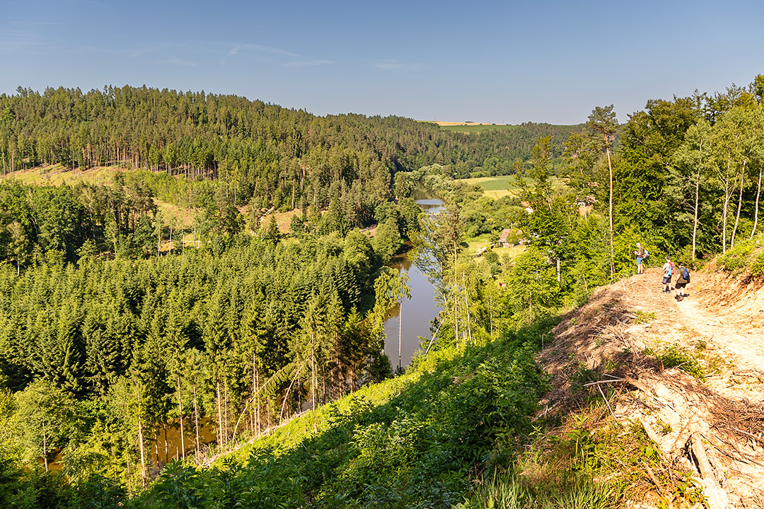 Po příjemném osvěžení jsme se vydali znovu po červené. Do Českého Šternberka to bylo ještě zhruba 5,5 km. Cesta opět trochu stoupala a odpojila se od řeky. Navíc se zde odpojil i Zbyněk, který si chtěl udělat jedno nedaleké Horobraní. Prošli jsme malebnou obcí Malovidy a poté pokračovali otevřeným terénem a slunce mělo i v tuto pozdně odpolední hodinu pořádnou sílu. Po zhruba kilometru se cesta konečně opět schovala do lesa a začala prudce klesat. Z bezejmenné vyhlídky byl potom krásný výhled na už nedaleký Český Šternberk. Právě na tomto místě se konečně spojil Zbyněk s Jirkou a Pavlem, zatímco Petr se s námi spojil telefonicky, aby nám oznámil, že už je v kempu v Českém Šternberku a že tam na nás počká. Při sestupu jsme se ztratili z červené značky a museli pak několik set metrů jít po kolejích.