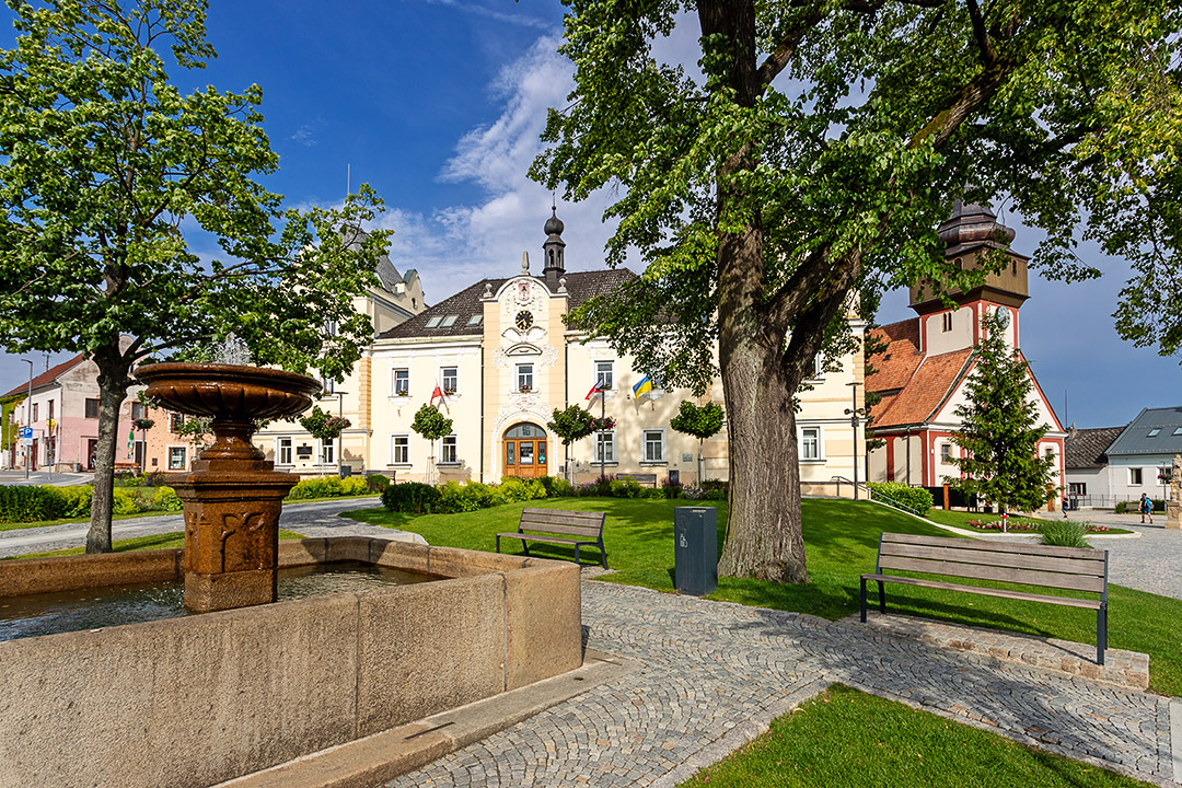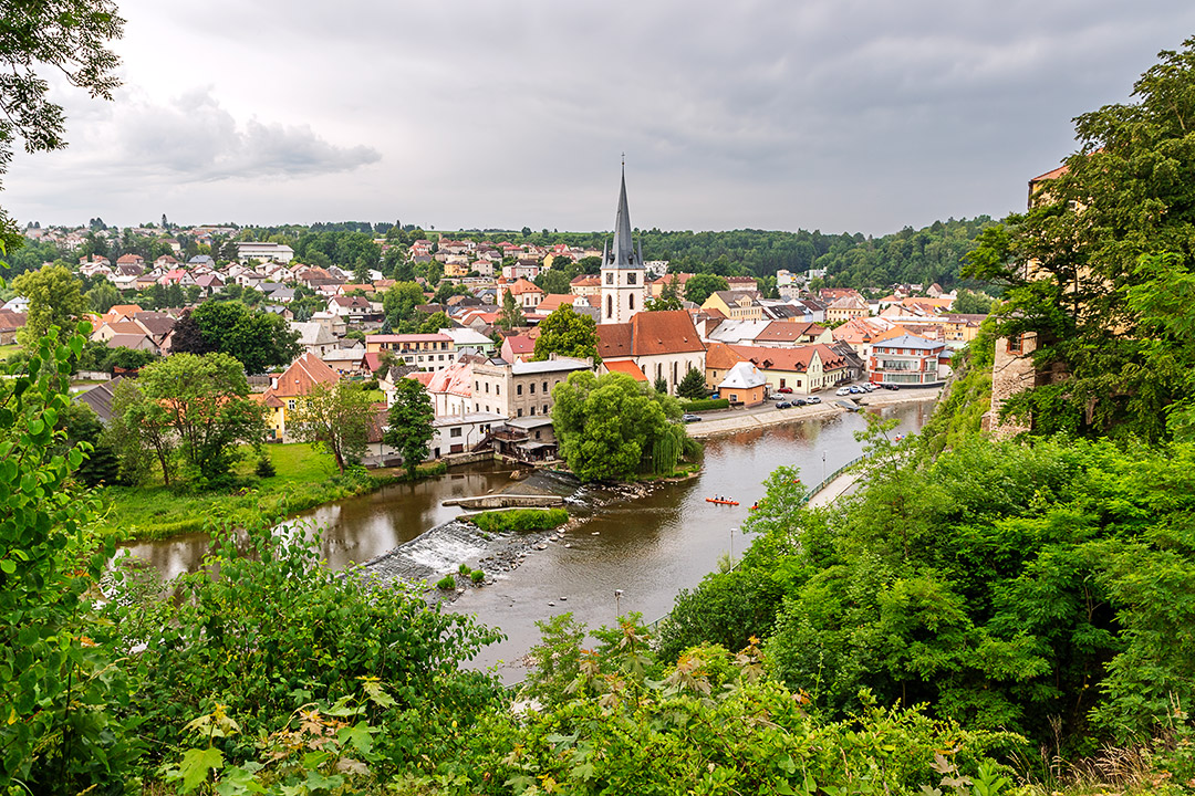 Do Světlé nad Sázavou to odtud bylo ještě 5 km, a jak byl krásný úsek kolem Stvořidel, tak cesta do Světlé, zejména od žst. Mrzkovice byla trochu nezáživná. Na jezu Smrčina jsme se znovu stihli vykoupat a spojit se s Petrem, který zde na nás čekal. Počasí se mezitím zkazilo a dokonce začalo i drobně pršet, avšak nakonec z toho nic moc nebylo. Poslední kilometry před Světlou jsme už ukrajovali po asfaltu a zmínku už stojí pouze vyhlídka Skála na okraji města. Zde se evidentně schází milenci :) Poté už jsme pokračovali typicky městskou zástavbou až do centra. Slunce se opět začínalo prodírat mezi mraky a než jsme došli na náměstí Trčků z Lípy, bylo opět krásně. Náměstí s kostelem sv. Václava je moc hezky opraveno. Ač někteří z nás strávili ve Světlé ŠVP, nikdo z nás si nebyl schopen nic konkrétního vybavit. Jelikož jsme byli hladoví, přemýšleli jsme, kam bychom se vydali na večeři, neboť do odjezdu našeho vlaku jsme měli poměrně dost času. Skupinka se zde rozdělila, přičemž Tomáš s Petrem se odebrali do asijské restaurace, Jirka se šel podívat do areálu zámku a Zbyněk zůstal sedět na vyhlídce u kostela. Jirka nakonec Zbyňka přemluvil, aby za ním přišel na zámek, že je tam kavárna, kde u kávy může pozorovat pávy. Zbyněk tedy dorazil a nakonec si zde dali výbornou zelňačku.
