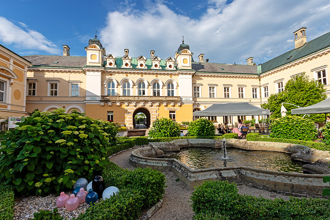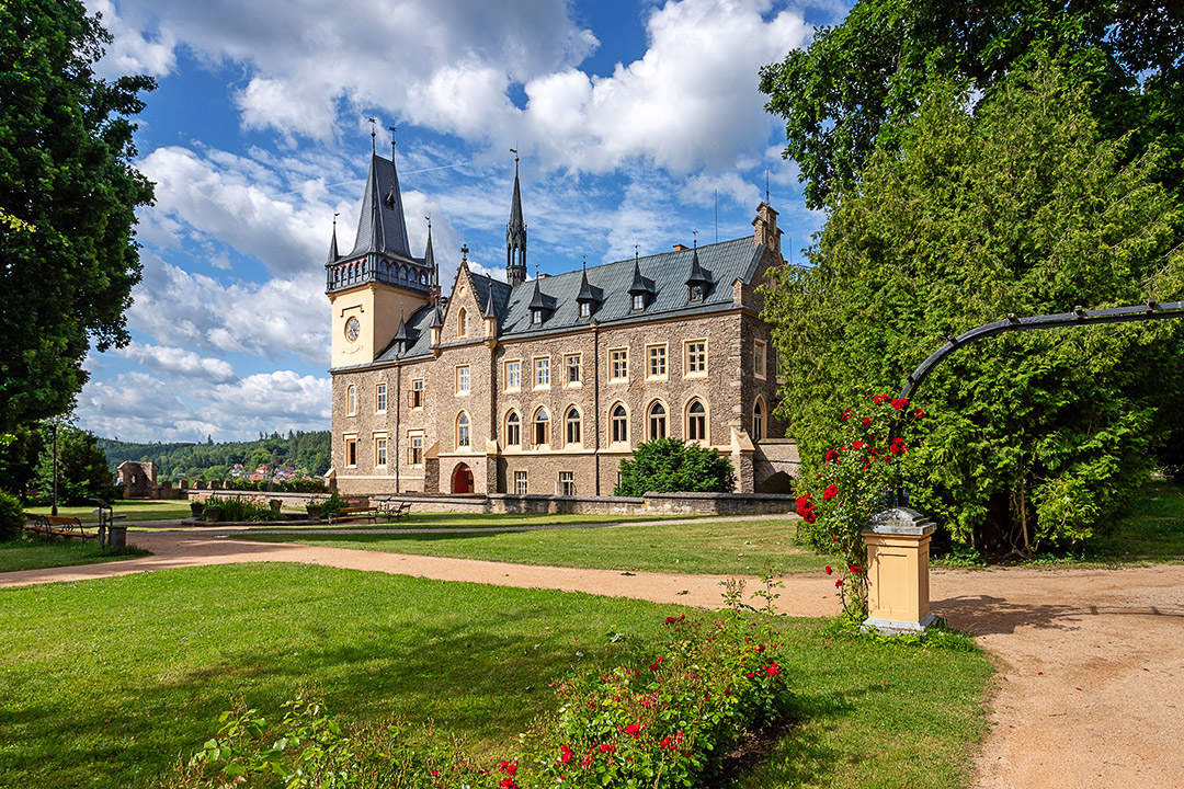 Domluvili jsme se, že se zajedeme nejprve podívat na místní zámek a poté navštívíme hrad Lipnice nad Sázavou. Na zámek to bylo zhruba kilometr, ale přesunuli jsme se sem již auty, abychom zbytečně neztráceli čas. Pseudogotický zámek z 19. století je moc hezky opraven, stejně tak přilehlá zahrada, Kolowratská věž či vodácké muzeum (nacházející se taktéž v zámeckém parku). Vše rozhodně stojí za návštěvu. My jsme prošli pouze park a šli se podívat na výhled z věže. Pak jsme ještě krátce poseděli u mobilní kavárničky v parku a tím se definitivně rozloučili se Zručí nad Sázavou.